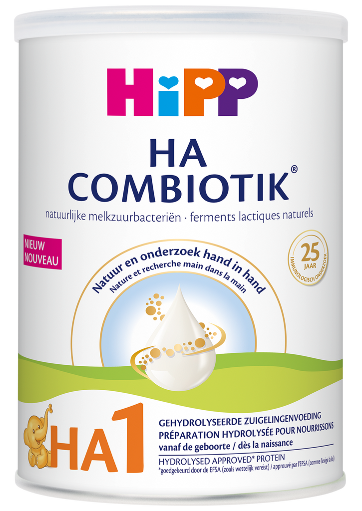 For parents seeking a premium hydrolyzed feeding option, we now offer the new HIPP Dutch Hydrolyzed HA 1 formula. This formula is the same as the well-known German version of HIPP HA1, with the extra benefit of somewhat more protein to aid in the growth and development of the infant. Dutch HiPP HA formula can be used to enhance breastfeeding or to replace a full meal. From birth to six months of age, HA1 formula is appropriate for newborns, and from six months on, HiPP Dutch HA2 can be used.